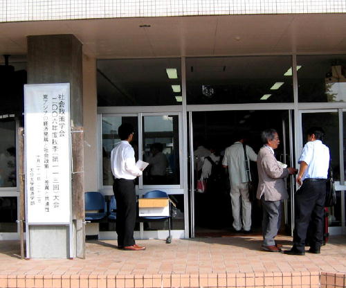 今回の大会では、会場を経済学部棟だけでまかなった。この建物は1960年末に完成した古いもので、私大のような立派な建物でも、また風格ある建物でもないが、教室にはパソコン、プロジェクター、マイク等の設備がそろっており、大会会場として問題はない。ただ、入り口が前方にある教室が多いため、分科会中の出入りにはやや難があったかもしれない。